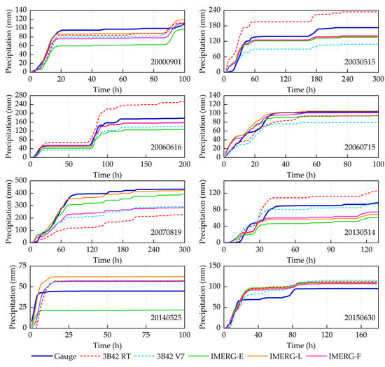 Comparison of the cumulative precipitation between gauge precipitation and the five SPPs of the eight historical flood events in 2000–2015 at the Ganxi hydrological station.