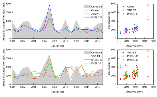 Figure 6 shows the annual maximum flow series and scatterplots of the observed and simulated runoff from 2000 to 2017. Regardless of whether the precipitation observed by the rain-gauge or the precipitation from the SPPs was used as the model-driven data, the annual maximum flood peak of the runoff simulation results was found to be lower than the observed flow, which may be limited by the time scale of the precipitation data. This indicates that the SPPs estimated for extreme flood events remained imprecise on a daily scale. In addition, the underestimation of heavy precipitation by SPPs may also be the reason for the low simulated flood peak flow. Compared with the post real-time precipitation products, the three sets of near real-time precipitation products showed improvement in terms of the annual maximum runoff; however, severe overestimation and underestimation persisted.