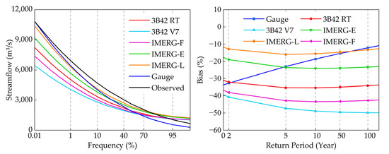 As shown in Figure 8, the design floods for the runoff simulated based on the rain-gauge data are consistent with the observations. The results for the near real-time products are superior to those of the same series of post real-time products (e.g., IMERG-L had a minor error in extreme floods and was close to the observed values). In contrast, the post-real time products were found to significantly underrate the design floods compared with the observation-based ones. Further, all five SPPs showed an underestimation of extreme floods, with the mean flood peak flow being lower than those observed. Concerning the relative error, the SPPs tend to overestimate floods with shorter return periods, gradually overestimating floods as the return period increased, most likely due to an overestimation of low flows and an underestimation of high flows in the runoff simulations. Among the five SPPs, IMERG-L achieved the best results, based on the determination that it fit well with the P-III distribution curve of the observed flow and was within the 15% error for return periods ranging from two to 100 years.