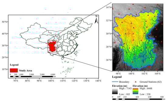 The HMR (24°35′–33°34′N, 96°56′–104°30′E) is located in Southwest China (Figure 1). It lies at the junction of the Qinghai–Tibet Plateau, Yunnan–Guizhou Plateau, and Sichuan Basin [], covering an area of approximately 5 × 105 km2. It is also the transition zone between the first and second terrains of China’s topography, which creates complex terrain conditions, and the regional elevation ranges from 330 to 6400 m, decreasing from the northwest to the southeast []. The maximum elevation difference in the area can exceed 6000 m, with the characteristics of high mountains, deep valleys, and large relative elevation differences. The HMR is located in a typical monsoon climate region, controlled by the South Asian and East Asian monsoons. In addition, it is influenced by the Tibetan Plateau monsoon and westerlies []. The complex terrain and various monsoons cause significant spatial and temporal differences in precipitation []. The average annual rainfall is as high as 1137 mm, and approximately 75–90% of the annual rainfall is concentrated from June to September [,], thus leading to frequent disasters in the mountains.