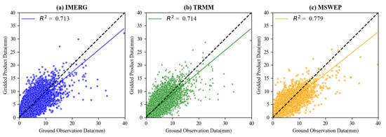 Daily precipitation scatterplots of ground observations versus the three products (a) IMERG, (b) TRMM, and (c) MSWEP at the watershed scale from 2001 to 2016. The black dashed line indicates the 1:1 correspondence, and the blue, green, and yellow solid lines represent the best linear regression fits for IMERG, TRMM, and MSWEP, respectively.