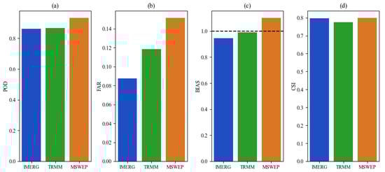 Categorical statistical indices ((a) POD, (b) FAR, (c) BIAS, and (d) CSI) of the three precipitation products at a daily scale.