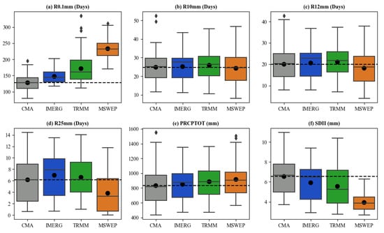 Boxplots for the six absolute threshold indices: (a) R0.1mm, (b) R10mm, (c) R12mm, (d) R25mm, (e) PRCPTOP, and (f) SDII for the observed data and the three products. The upper and lower edges of the box mark the upper and lower quartiles (75% and 25%, respectively). The solid line in the box marks the median value. The uppermost and lowermost horizontal lines mark the 1.5I QR outliers. The point marks the average value. The black dashed line indicates the mean value of the indices of the observed data.