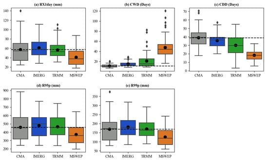 Boxplots for the three maximum indices: (a) RX1day, (b) CWD, and (c) CDD, and two percentile indices, (d) R95p and (e) R99p, for the observed data and the three products.
