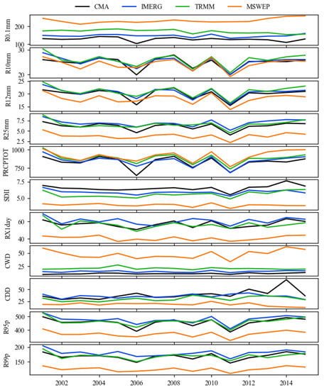 Mean extreme precipitation indices of the 62 rain gauge stations, and the corresponding IMERG, MSWEP, and TRMM estimates from 2001 to 2016.