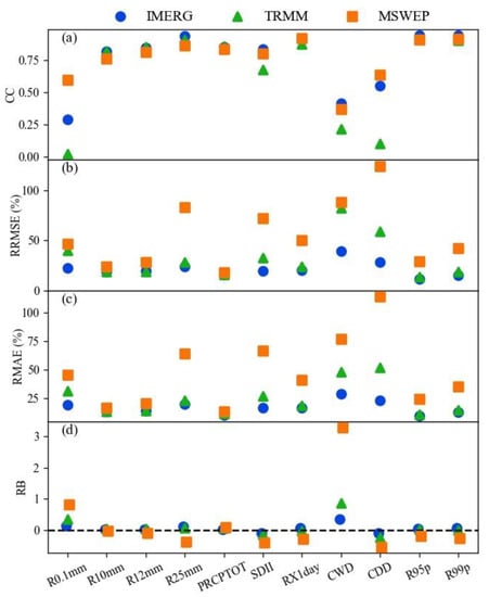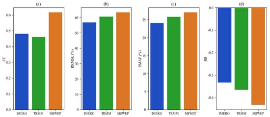 Continuous statistical metrics ((a) CC, (b) RRMSE, (c) RMAE, and (d) RB) of the three precipitation products for Max99.