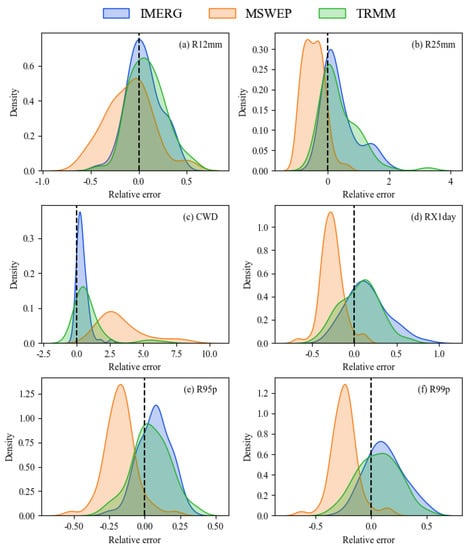 Extreme precipitation index: (a) R12mm, (b) R25mm, (c) CWD, (d) RX1day, (e) R95p, and (f) R99p kernel density estimate distribution curves for the three precipitation products.
