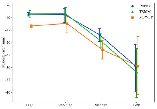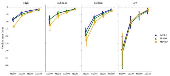 The absolute errors between the ground observation data and gridded products were calculated for the four defined precipitation time series, and the results are shown in Figure 9. All three precipitation products underestimated the actual precipitation to varying degrees at all elevations, with MSWEP underestimating the lowest altitude. The error generated by the three products decreased with increasing rainfall intensity. At Max99, there was a clear trend of decreasing accuracy for the three products as the altitude decreased (Figure 10). The error characteristics of IMERG and TRMM were similar at almost all elevations. For the most part, the deviation of the MSWEP was the maximum, with absolute errors close to −15 at high altitudes and up to −25 at medium altitudes. Figure 11 shows a comparison of the statistical metrics of the Max99. The MSWEP had the largest CC value, exceeding 0.6, but also showed the largest deviation (RRMSE > 60%, RMAE > 25%, RB < −0.4). IMERG had the best RMAE, RRMSE, and RB values, indicating a smaller deviation from the observed values. As a result, IMERG had the strongest detection ability for heavy precipitation.