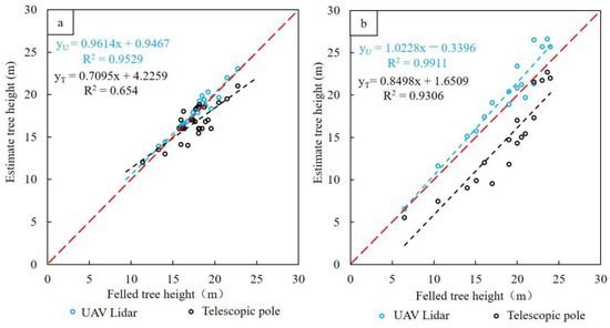 Relationship between reference data and estimated heights using Lidar and a telescopic pole for Masson pine (a) and Eucalyptus (b).