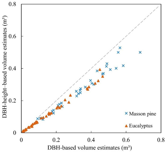 Because double-entry models usually produce more accurate volumes than single-entry models, we took the volumes from the DBH–height-based models as references for comparisons (Table 6). The results show that the DBH-based models underestimated the tree volumes by 0.071 m3 for Masson pine and 0.034 m3 for eucalyptus; the corresponding relative errors were 21.18% and 23.86%, while the RMSEr were 24% and 33.9%, respectively. This situation implies the preference for using DBH–height-based models for tree volume calculation.