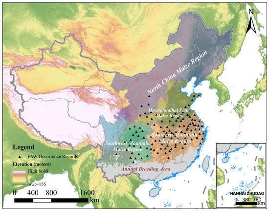 China is influenced by the East Asian monsoon, with southwesterly winds prevailing in spring and summer, and northerly winds in autumn and winter [15]. The local FAW in the annual breeding area and the invasive FAW from Southeast Asia can disperse northward under suitable conditions with the help of favorable seasonal wind currents. The main strains of FAW that invaded China were maize strains, and the damage caused by the FAW to maize far exceeds that of other crops in China [14,35]. Also, western China, especially the Qinghai-Tibet Plateau, has the advantage of a natural barrier to insect invasion--its high altitude. Thus, we focused on four major maize growing regions in eastern China (Figure 1), which account for more than 90% of the total annual production of maize in China [36].