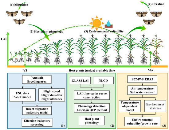 Methodological framework. Steps 1–4 in the upper part show a schematic representation of the FAW life cycle (described in the text). These steps are linked to the three modules presented in boxes in the lower part, which show the corresponding technical flow: (Box 1) Insect migration simulation module; (Box 2) Host plant phenology extraction module; (Box 3) Environmental suitability analysis module. A portion of the image materials is sourced from [46,47].