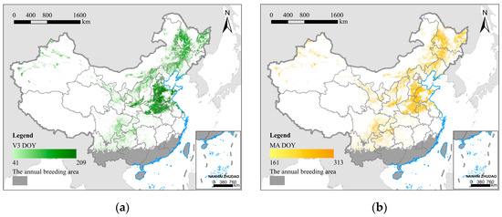 The mean DOY of the key phenological stages of maize, the main host plant for FAW in China from 2010 to 2019; (a) the 3rd leaf stage (V3); (b) the maturity stage (MA). The dark gray area represents the annual breeding area.