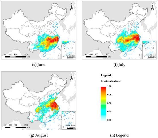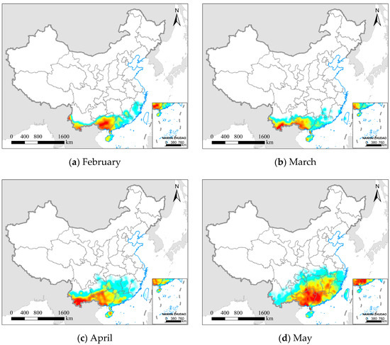 Kernel density analysis (KDA) was performed on the monthly screened landing points, and the bandwidth was computed using Silverman’s Rule of Thumb and ranked from the smallest to the largest density quantile of the landing points. The results are shown in Figure 5, which indicate the potential spatial distribution range and relative abundance of the FAW from February to August 2020. During this period, FAW populations spread from their overwintering breeding areas in southern and southwestern China to seasonal feeding areas in eastern and northern China.