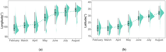 To quantitatively characterize the spatial distribution of the FAW, a combination of box-line and violin plots (RainCloud plots) of the distribution of the FAW for latitude and longitude and their probability density were plotted for each month [68], as shown in Figure 6.