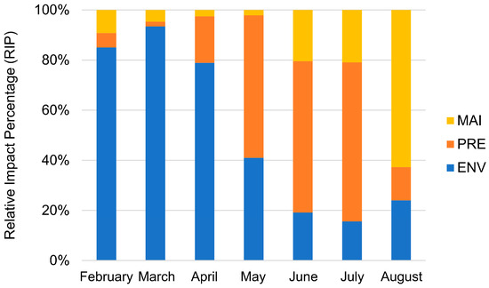In the model simulation results, the FAW that completed their life cycles in suitable areas accounted for 17.18% of the total simulated amount. To quantitatively evaluate the influencing factors of the FAW in the process of northward migration in China, we calculated the normalized value of the ratio of the trajectories restricted by the following conditions to the total restricted trajectories each month, as the relative impact percentage (RIP) of the factor (Figure 7): (1) Affected by environmental factors (ENV, including air temperature, soil water content), FAW cannot develop and survive normally; (2) FAW migration terminated due to precipitation (PRE); (3) Maize phenology (MAI) did not match the period of the invasion of the FAW, resulting in a lack of food resources.