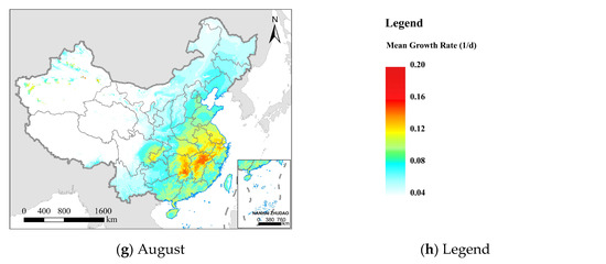 The mean daily growth rate (environmental suitability) of FAW from February to August 2020; (a–g) represent different months; the white areas represent areas that are not suitable for FAW; and (h) the legend from blue to red represents increased growth rate and environmental suitability.