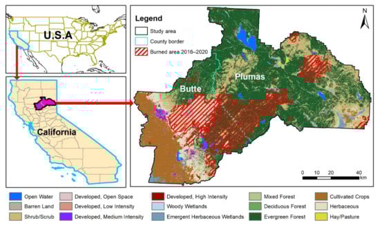 According to wildfire activity statistics from CAL FIRE in 2020, wildfire agencies responded to an average of 8198 fires that burned 7263 km2 per year from 2016 to 2020 []. Three of the deadliest, largest, and most destructive California wildfires occurred in Butte and Plumas County []. The Dixie Fire was caused by powerlines and burned 3898 km2, killing one person and damaging 1329 structures in July 2021. The North Complex Fire was caused by lightning and burned 1291 km2, took 15 lives, and destroyed 2352 structures in August 2020. Another devastating wildfire that occurred in November 2018 was the Camp Fire, which burned 621 km2, claimed 85 lives, and destroyed 18,804 structures. The secondary effects of wildfires include health problems, reduced air quality, and economic losses due to wildfire evacuation [,,]. In terms of long-term impacts, wildfires discharge aerosols and produce carbon emissions that affect the climate and climate change-related phenomena that drive even more wildfires [].