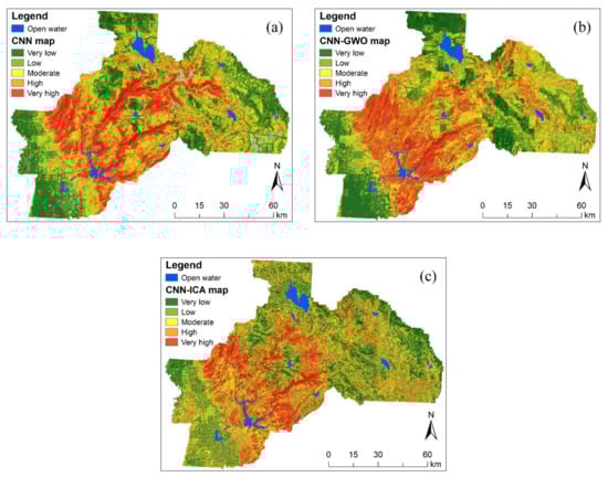 The construction of the database has been performed, including: (i) the dependent variables (i.e., damage location by wildfire derived by the DPM method and Sentinel-1 product) and (ii) the independent variables (based on topographical, meteorological, environmental, and anthropological). The creation of wildfire susceptibility maps utilizing the training dataset were compiled employing the damage inventory database from the DPM of the wildfires from 2016 to 2020 and applying deep learning with metaheuristic optimization approaches, as discussed above. The wildfire susceptibility maps depict an assessment of the likelihood of experiencing a wildfire in a study area built upon the 16 conditioning factors considered. Figure 7 shows the wildfire susceptibility maps from the CNN, CNN-GWO, and CNN-ICA models. Using the quantile method, we classified the regions of the wildfire susceptibility maps into five predicted classes: very low, low, moderate, high, and very high [,].