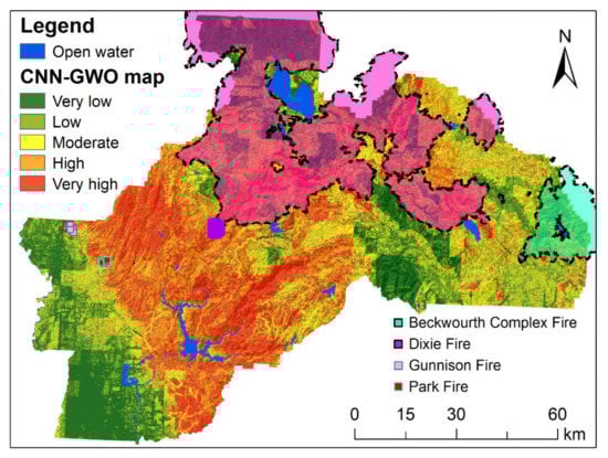 The FR value of each class of wildfire conditioning factors was utilized to produce wildfire susceptibility maps using deep learning algorithms based on CNN, CNN-GWO, and CNN-ICA.