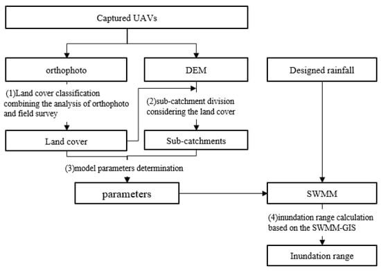 As shown in Figure 4, the proposed framework of the waterlogging assessment on the ancient city site of PuZhou was divided into four parts: (1) land cover classification combining the analysis of UAVs and the field survey; (2) sub-catchment division considering the land cover; (3) model parameter determination; (4) inundation range calculation based on the SWMM-GIS. Each part is described as follows.