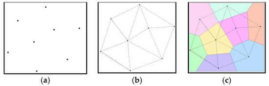The construction process of the Voronoi diagram, (a) the selected nodes; (b) the Delaunay triangle; (c) Voronoi diagram.