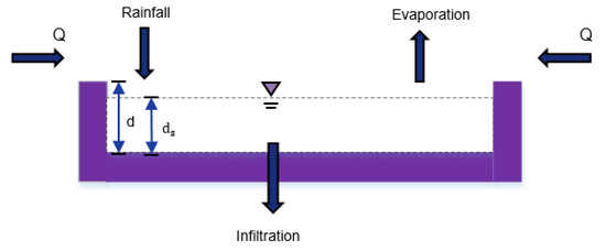 In the rainfall process, the physical process of runoff generated by the fish pond is complex. As shown in Figure 8, Q represents the surrounding surface runoff, D represents the depth of the fish pond, and represents the depth of runoff generated by the pond. After evaporation and infiltration, rainwater generates runoff inside the pond, but unlike the surface runoff on the plane, the runoff generated will not converge outward. Through a field investigation, it was found that the depth d of the pond in the site area was generally about , which was far greater than the sum of the runoff generated by the pond during rainfall and the surrounding surface runoff. Therefore, to obtain high-precision simulation results, the influence of the pond must be considered.