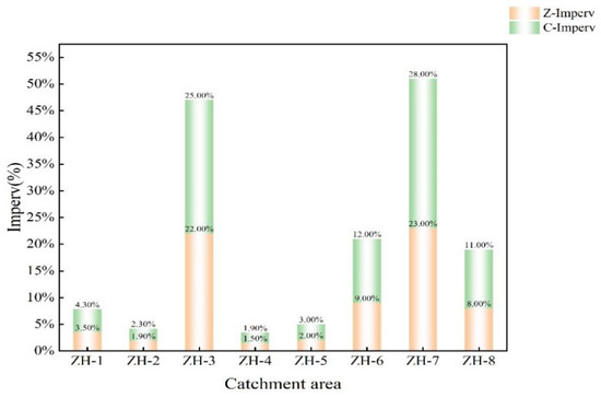 The area of each imperviousness sub-catchment is shown in Figure 10. C-Imperv and Z-Imperv represent the impervious rates before and after removing the fish pond, respectively. It is obvious that the impervious rate increases significantly when the fish ponds are considered, and the highest impervious rate and the lowest impervious rates are 28% and 1.9%.