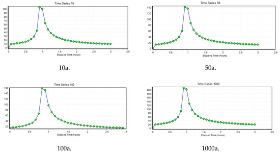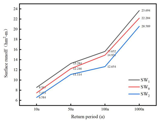 The simulated comprehensive runoff coefficient was calculated by the simulated surface runoff value and was simulated and output by the results of the rainfall return periods 10a., 50a., 100a., and 1000a. as shown in Figure 13. With the different return periods of the rainfall, the calculated runoff coefficients of the variation derived from , , and are shown in Table 5.