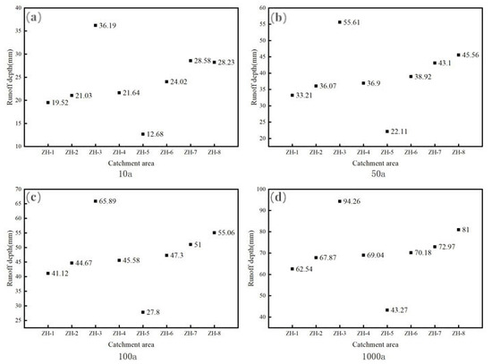 Runoff depth refers to the depth of the water layer obtained by flattening the total amount of runoff on a certain overflow section over the watershed area above the section during the calculation period. It is important data used for calculating the inundation range [43]. Based on the simulation of the SWMM model, the surface runoff depths of the ancient city of PuZhou with the return periods of 10a., 50a., 100a., and 1000a. are shown in Figure 14. The maximum runoff appeared in sub-catchment area 3 and reached 36.19, 55.61, 65.89, and 94.26 mm, respectively; the minimum runoff was in the sub-catchment area and reached 12.68, 22.11, 27.8, and 43.27 mm, respectively.