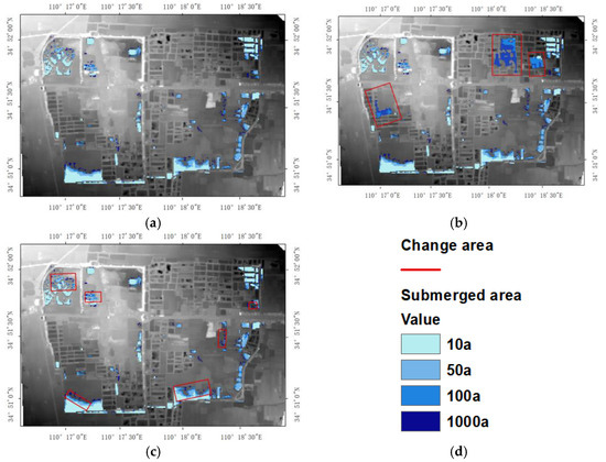 The flood inundated ranges of different recurrence periods. The inundation areas of (a) , (b) , (c) ,(d) legend.