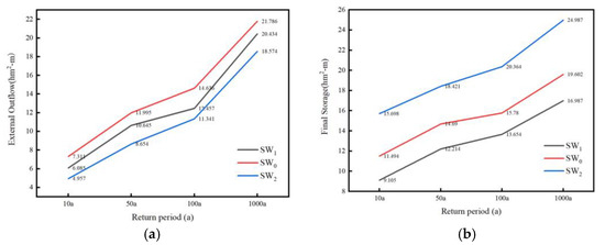 In , the fish ponds were regarded as depressions, and the rainwater flowed into the fish ponds during the simulation process. Hence, the final water storage of the increased compared with , and the maximum difference between the and reached 5.385 ) as shown in Figure 16b. As plenty of rainwater was stored in the fishponds, the surface runoff of was smaller than that of , as shown in Figure 13. Similarly, the outgoing flow of was lower than that of , as shown in Figure 16a. Table 7 shows that the inundation area of the was smaller than that of , and the inundation area was reduced by 4.4%, 6.7%, 5.9%, and 9% at return periods of rainfall, respectively. It can be seen from Figure 15c that the area where the reduced inundation area was located was the area with the low slope. is more reasonable.