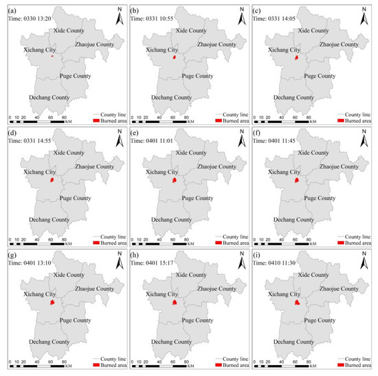 The location and shape of the fire line were extracted from multi-source remote sensing data (Figure 4). At 12:45 p.m. on 29 March, the image monitoring indicated that the burned area was 1.05 km2 (Figure 4a). At 11:45 a.m. on 30 March, the burned area was 8.97 km2 (Figure 4b), and by 12:30 p.m., the burned area had reached 17.08 km2 (Figure 4d), within 45 min, and the fire spread by 8.11 km2. By 14:05 p.m. on 31 March, the fire burned area reached 106.35 km2 (Figure 4f). The rapid spread of this stage brought great difficulties to the rescue. By 11:35 a.m. on 1 April, the fire burned area was 125.89 km2 (Figure 4g), and the fire was initially controlled at this timepoint. However, the fire reignited again, due to the sudden change of wind direction and the accelerated wind speed. On 5 April, the fire was controlled and extinguished, and the final burnt area was 209.17 km2 (Figure 4i).