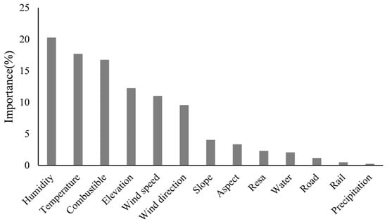 A random forest algorithm was used to rank 13 variables of forest fire spread (Figure 8). The relative humidity was the most important variable affecting the spreads of the two selected forest fires in Sichuan Province, followed by temperature. Altitude had the greatest impact among terrain factors, while other terrain factors (slope, aspect) had relatively weak effects on the forest fire spread. The importance of combustible type was higher, below only relative humidity and temperature. The importance of human factors was overall lower, while the location in residential areas and rivers was higher than roads and railways.