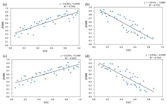 The vegetation coverage of Muli County is depicted before the fire and one year after the fire (Figure 9a,b) and Jingjiu Township before and one year after the fire (Figure 9c,d), respectively. In this study, 40 points were randomly selected from the pre-fire VFC, the post-fire VFC and the dNBR images, respectively, to build the relationship between the VFC and dNBR, respectively (Figure 10). The results for Muli County and Jingjiu Township were similar. Both pre-fire VFCs were significantly proportional to dNBR, with an R2 of 0.79 and 0.76, respectively (Figure 10a,c). Both post-fire VFCs were inversely proportional to dNBR, with an R2 of 0.77 and 0.74, respectively (Figure 10b,d).