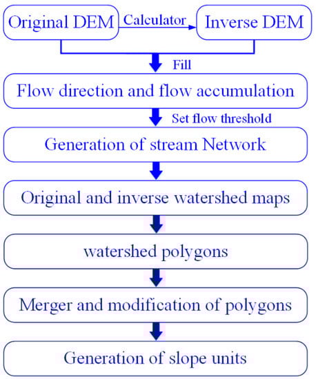 The hydrological method is used to extract the slope unit because it can better represent the spatial distribution of landslides in the study area. The essence of slope unit obtained by the hydrological method is the surface hydrologic analysis based on DEM, including the generation of positive and negative topographic DEM without depression, extraction of flow direction, calculation of flow accumulation, and generation of stream network [8]. As shown in Figure 2, the basic principle is to extract valley lines and ridge lines (corresponding to the catchment lines and water dividing lines, respectively) from positive and negative terrains, fuse the generated catchment basin with the reverse catchment basin, and then modify unreasonable slope units through a manual correction. Finally, the hydrological slope unit is the region composed of catchment lines and dividing lines [33].