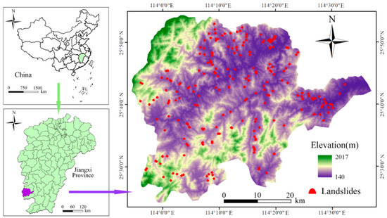 Chongyi County is located in the southwestern border of Jiangxi Province, China, covering an area of 2206.3 km2. The terrain of Chongyi County is mostly hilly and mountainous, with an altitude of 900~2600 m. The terrain of the county tilts from southwest to northeast. The landform types are mainly low and medium altitude mountains (≥500 m), high hills (300~500 m), and valley terraces (≤300 m), accounting for 47.67%, 45.06% and 7.27% of the total area, respectively. The geological units of the area are complex, and mainly include the magmatic rock, carbonate rock, clastic rock, and metamorphic rock. Chongyi County is located at low to mid-latitudes and belongs to the central subtropical monsoonal humid zone with abundant rainfall. The average rainfall from 1980 to 2021 reaches 1629.6 mm, and the average annual temperature is about 17.8 °C. The land cover types mainly include forests, agricultural land, buildings, etc.
