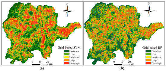 Landslide susceptibility map results using the grid units. (a) Grid-based SVM; (b) Grid-based RF.