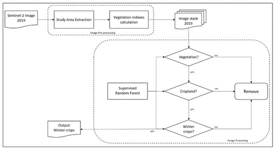Besides the contributions of the new generation of EO data, the diversity of the classification approaches and methods have provided more resources for agriculture mapping and monitoring. The classical, direct extraction approach is the traditional and most used classification approach that is used to extract single or multiple crop types directly from satellite images [12,13,14]. Moreover, we also propose the hierarchical classification approach for crops mapping in this study. Hierarchical classification is well known for its capacity to solve a complex classification problem by separating the problem into a set of smaller progressive classifications; it produces a series of thematic maps to progressively classify the image into detailed classes. Wardlow and Egbert [12] investigated the applicability of time-series Moderate Resolution Imaging Spectro-radiometer (MODIS) 250 m normalized difference vegetation index (NDVI) data for large-scale crop mapping in the Central Great Plains of the U.S. The hierarchical classification scheme was applied in this study with high classification accuracy, and instead of directly solving a complex irrigated crop mapping problem, a four-level hierarchical classification framework was implemented to produce a series of crop-related thematic maps that progressively classified cropland areas into detailed classes. Ibrahim et al. in 2021 [15] have also employed the hierarchical classification scheme to map crop types and cropping systems in Nigeria, using the RF classifier and Sentinel-2 imagery. Firstly, they produced a land cover map with five classes in order to eliminate other land cover types, then the next classification was performed only on cropland, where the specific crop types and cropping systems were mapped. The results indicated that the crop types were well classified with high accuracy, despite the study area being heterogeneous and smallholder-dominated.