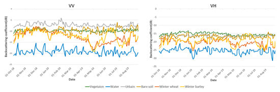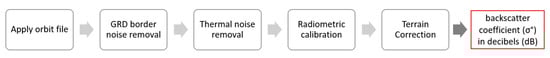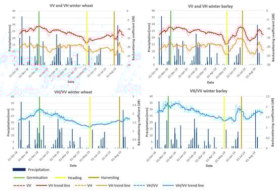 The first step in applying the orbit file aims at updating the orbit metadata with a restituted orbit file, then Ground Range Detected (GRD) border noise removal attempts were performed to remove the low intensity noise and invalid data on the scene edges. Afterward, a thermal noise removal function aims to remove the additive noise in sub-swaths to reduce the discontinuities between sub-swaths for scenes in different acquisition modes. Thereafter, radiometric calibration is applied to compute the backscatter intensity, and subsequently, a terrain correction, also called an orthorectification, was performed to convert the data from ground range geometry to σ° [69]. Lastly, dB was calculated from σ° with the equation dB = 10 × log10σ°. A series of line charts in dB were plotted for each polarization and ratio of each winter crop.