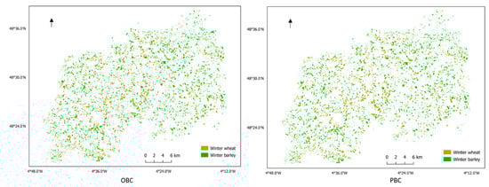 The classification results of the different approaches and methods of the winter wheat and winter barley and their accuracy analysis are presented in this part. Firstly, the results of PBC and OBC of each step in the hierarchical classification are demonstrated and evaluated through accuracy assessments, the more accurate results were retained for further processing and comparison with classical direct extractions. Then the final results of the hierarchical classification and classical direct extraction are displayed and compared with accuracy assessments as well.