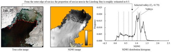 The data is then preprocessed. The main preprocessing includes the atmospheric correction, removal of the land area, sea ice/seawater extraction, etc. The preprocessing process and related threshold selection are the same as Yuan et al. [29]. The determination of the NDWI threshold is mainly based on the Bayes classification criterion, and the intersection (“valley”) of the ice and water distribution curves in the NDWI distribution histogram is used as the threshold for ice and water identification. When there are multiple valleys in the histogram, the determination of the threshold also needs to take into account the actual number of sea ice, and finally determine the ice-water segmentation threshold, combined with manual interpretation of the true color images, as shown in Figure 2.