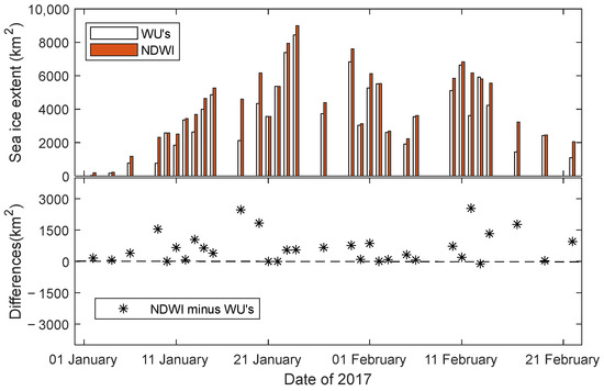 The spatial distribution of sea ice extent retrieved by the NDWI method shows a good agreement with the true-color composite image. Using the manual interpretation, the sea ice extent was extracted from the true-color composite image and listed in Table 4. It can be seen that the sea ice extent obtained by WU’s method is obviously smaller than that shown by the true-color composite images, and the sea ice extent obtained by NDWI is closer to the results of the true-color composite image. The difference between the sea ice extent extracted by NDWI and true-color composite image is mostly within 1000 km2, and the relative error is within 20%. On 14 February, the difference in sea ice extent between the NDWI and the true color image was large, with a relative difference of about 28%. It can be seen from the spatial distribution map that the sea ice in the western part of Liaodong Bay was inverted as a water area by the NDWI method on 14 February. From the true-color composite image, it can be seen that the color of sea ice and sea water in the western part of Liaodong Bay on February 14 was relatively close. On 17 February, the western part of Liaodong Bay was all water areas, and the extent of sea ice in Liaodong Bay was greatly reduced. It can be inferred that the thickness of the sea ice in the western part of Liaodong Bay was thin on February 14 and this area was determined as water. This results in the inverted sea ice extent being significantly smaller. In addition, the sea ice extent calculated by the artificial judgment method of the true-color composite image is the whole area within the outer edge of the ice area in Liaodong Bay. In other words, the water area within the outer edge of the ice area is regarded as ice area, which leads to an overestimation of sea ice extent. In terms of inversion of the sea ice extent, the NDWI method has a better performance than WU’s method.