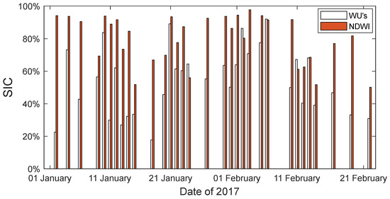The average value of the error of SIC obtained by the NDWI method is about 4%, and that of WU’s method is about −4%. This means that the accuracy of SIC obtained by the two methods is not significant. Consistent with the visual verification results, the SIC obtained by the WU method is relatively small, and the SIC obtained by the NDWI method is relatively large. The mean deviation of the error of the SIC obtained by the NDWI method and WU’s method is about 6% and 10%, which shows the precision of the SIC obtained by the NDWI method is better than WU’s method. This is consistent with the validation results of visual observations.