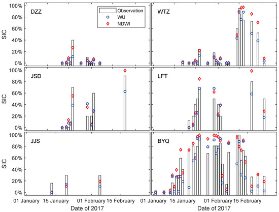 (3) Landsat 8 OLI data with a resolution of 30 m on 10 January is selected for verification, which is more consistent with MODIS data acquisition time. The validation results show the precision of SIC obtained by the NDWI method is better than WU’s method, which is consistent with the validation of visual observation.