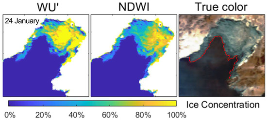 The dates when the absolute difference of the averaged SIC in Liaodong Bay obtained by the two methods was greater than 40%, and the absolute difference of sea ice extent was less than 1000 km2 were found, which were 11 and 14 January, and 10 and 20 February. The spatial distribution of SIC on these dates is shown in Figure 7. In the four days, the SIC inverted by the NDWI is much higher than that inverted by WU’s method. In the four days, the SIC in Liaodong Bay retrieved by the NDWI was relatively large, mostly greater than 80%, which is a reasonable distribution in the main ice area and is more consistent with the distribution of sea ice in the true-color composite image. Under normal circumstances, the sea ice in the main ice area is easy to accumulate, and the concentration is generally higher. The inverted results of the NDWI can reflect the accumulation characteristics of sea ice in the ice area. In the past few days, the SIC of the central location of the ice area retrieved by WU’s method is mostly less than 50%, which is inconsistent with the distribution characteristics of sea ice in the true color map and does not satisfy the general distribution characteristics of SIC.
