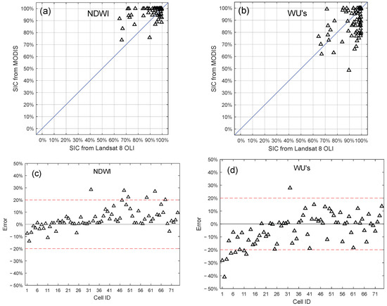 The SIC obtained by (a) the NDWI method and (b) WU’s method as well as the observation value. The time series of the SIC error obtained by (c) the NDWI method and (d) WU’s method. Only the valid comparison samples in Figure 8 are shown.