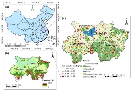 The study area is located in Xuancheng City, Anhui Province, China (Figure 1), covering an area of 5568 km2. The area has a subtropical humid monsoon climate [49]. The average annual precipitation is 1243 mm, and the average annual temperature is ~17 °C. The elevation of the area is between 0 and 1058 m, with a lower flat plain in the northwest, higher mountains in the south, and valleys in the northeast. According to the Chinese genetic soil classification system, red soil and paddy soil are the main soil types in the study area. The study area is mainly covered by cultivated land with various crops, such as rice, wheat, oilseed rape, and forest [50].