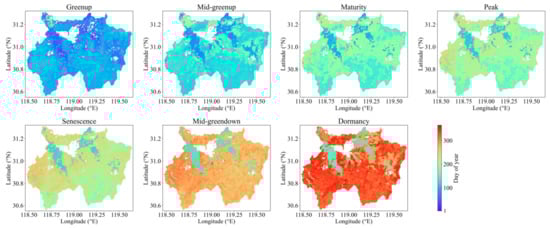 Several satellite sensors, such as the Moderate-Resolution Imaging Spectroradiometer (MODIS), Landsat, the Advanced Very High Resolution Radiometer (AVHRR), have been used for studies of LSP, with MODIS being the most-used satellite data source [22]. The global LSP metrics are provided by the MODIS land cover dynamics product (MCD12Q2) from 2000 and are based on time series of land surface greenness at a spatial resolution of 500 m [54]. This product has been well-validated [55,56]. The MCD12Q2 product has two vegetation cycle records each year and a total of 25 science datasets (SDSs). The 25 SDSs include one layer indicating the number of vegetation cycles, four layers indicating the quality of the phenological metric retrievals, and twenty layers indicating phenological metrics.