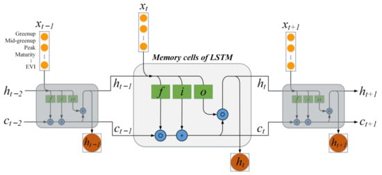 LSTM is a deep learning model developed for learning temporal features from time-series or sequential data. A typical LSTM model consists of input layers, hidden layers (memory cells), and output layers (Figure 5). The input layer is the time-series data. The hidden layer is composed of one or more memory cells to extract the temporal features of the input data. The cell state () is a memory of an LSTM cell, which represents the accumulated information from previous time steps. The hidden state () is an output of a cell. Both of them are controlled by three gates: a forget gate (), an input gate (), and an output gate () [42,62]. The three gates determine retained information from the previous time step () and how much information to output at the current time step (). In the -th step, the current forget gate () (Equation (2)) of the present memory cell decides how much information from the previous time step should be thrown away before passing into the current cell state (). Then, the input gate () (Equation (3)) decides what percentage of information of the potential cell state () is used to update the current cell state (), and is updated by and (Equations (4) and (5)). Finally, the output gate () decides what information from the current cell state is provided to the current hidden state (), which is regarded as the output from the current memory cell (Equations (6) and (7)).